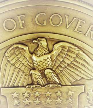 The Third Reich famously adopts this aesthetic of mass, exemplified by films such as The Triumph of the Will. The use of the German Eagle in their propaganda is one such powerful motif. But they are far from alone in using mass and associating it with state power. The Soviet examples are myriad. But this use is not limited to totalitarian states. Here is, for example a contemporary Federal Reserve eagle, and this one from Canada